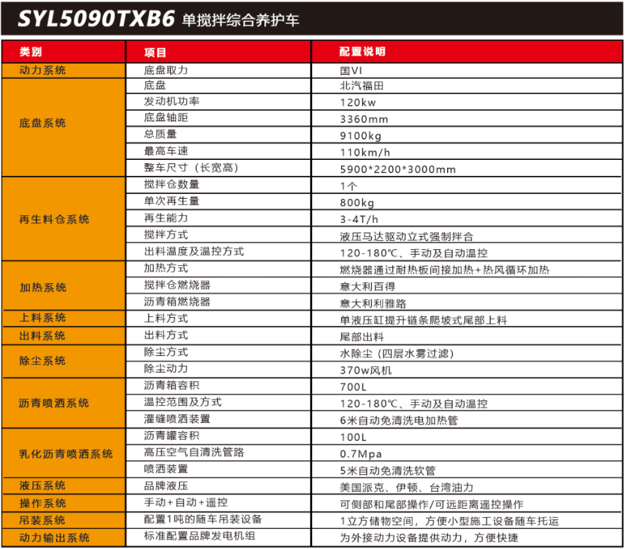 SYL5090TXB6 單攪拌綜合養護車是一款集現場生產新瀝青混合料、瀝青路面冷料、 舊料、銑刨料 100%現場加熱再生利用 ,熱瀝青灑布、裂紋跟蹤灌縫、乳化瀝青噴灑、為其他裝置提供電力和液壓動力等多種功能于一體的瀝青路面熱再生綜合養護車。可實現多 場合、多路面的各種類養護作業 ,養護修補費用低 ,作業快捷 ,高效率、節能環保性能突 出等特點。適用于市政、? 國省道路、鄉村公路、廠區、園區等狹窄區域瀝青路面小型養護修補施工。