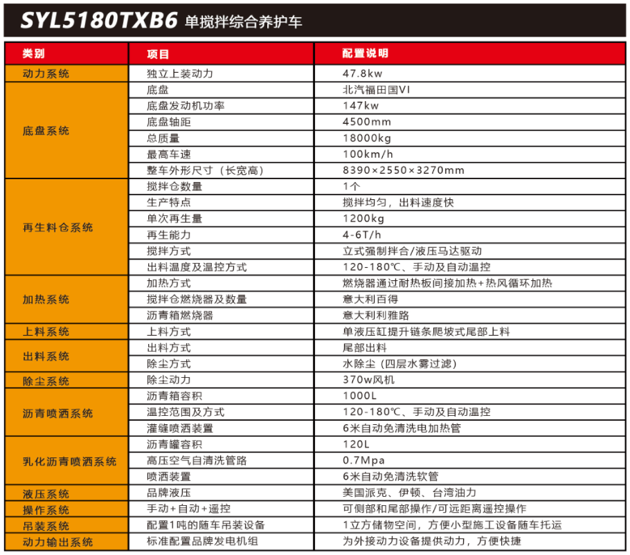 SYL5180TXB6 單攪拌綜合養護車是一款集現場生產新瀝青混合料、瀝青路面冷料、 舊料、銑刨料 100%現場加熱再生利用 ,熱瀝青灑布、裂紋跟蹤灌縫、乳化瀝青噴灑、為 其他裝置提供電力和液壓動力等多種功能于一體的瀝青路面熱再生綜合養護車??蓪崿F多 場合、多路面的各種類養護作業 ,養護修補費用低 ,作業快捷 ,高效率、節能環保性能突 出等特點。適用于遠郊較寬闊區域中小施工量和高速公路的修補施工。