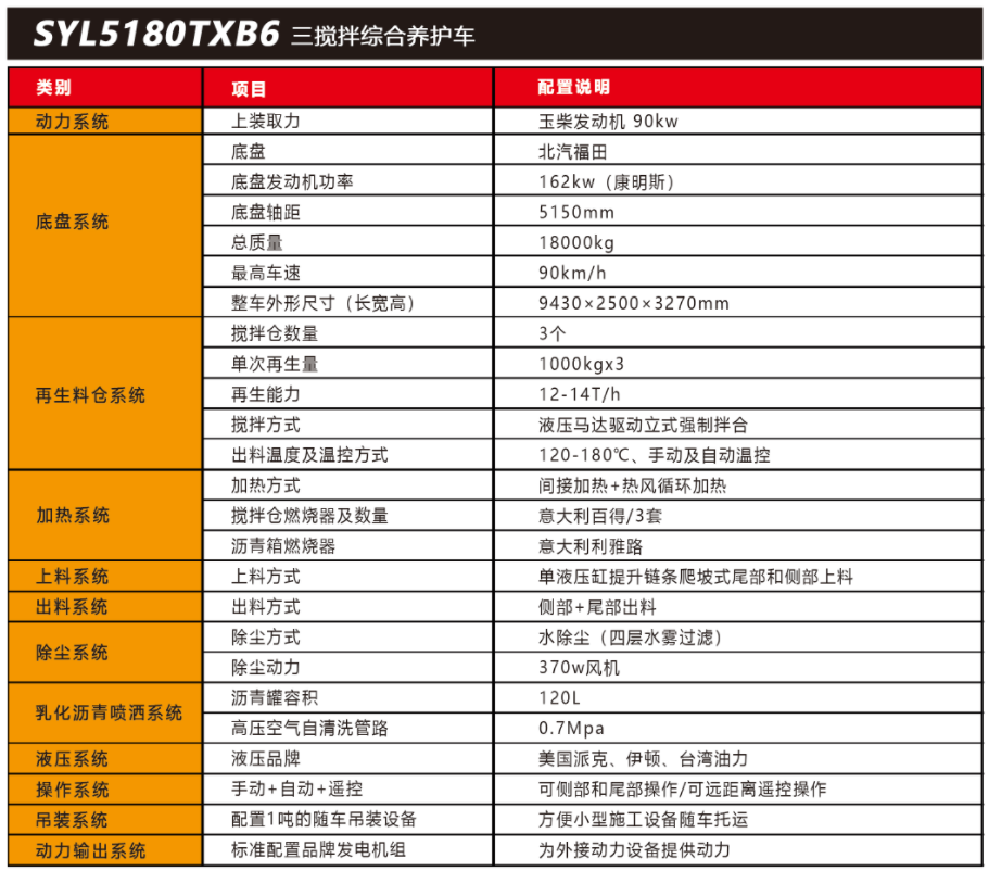 SYL5180TXB6 三攪拌路面綜合養護車是一款集現場生產新瀝青混合料、瀝青路面冷 料、舊料、銑刨料 100%現場加熱再生利用,熱瀝青灑布、裂紋跟蹤灌縫、乳化瀝青噴灑、 為其他裝置提供電力和液壓動力等多種功能于一體的瀝青路面熱再生綜合養護車。可實現多場合、多路面的各種類養護作業。養護修補費用低 ,作業快捷 ,高效率、節能環保性能