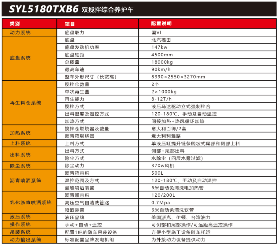 SYL5180TXB6 雙攪拌路面綜合養護車是一款集現場生產新瀝青混合料、瀝青路面冷 料、舊料、銑刨料 100%現場加熱再生利用,熱瀝青灑布、裂紋跟蹤灌縫、乳化瀝青噴灑、 為其他裝置提供電力和液壓動力等多種功能于一體的瀝青路面熱再生綜合養護車??蓪崿F 多場合、多路面的各種類養護作業 ,養護修補費用低 ,作業快捷 ,高效率、節能環保性能突出等特點。適用于多種路況的中大施工量和高速公路的修補施工。