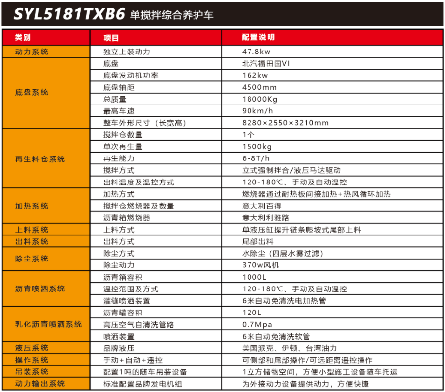 SYL5181TXB6 單攪拌綜合養護車是一款集現場生產新瀝青混合料、瀝青路面冷料、 舊料、銑刨料100%現場加熱再生利用 ,熱瀝青灑布、裂紋跟蹤灌縫、乳化瀝青噴灑、為其他裝置提供電力和液壓動力等多種功能于一體的瀝青路面熱再生綜合養護車??蓪崿F多場合、多路面的各種類養護作業 ,養護修補費用低 ,作業快捷 ,高效率、節能環保性能突出等特點。適用于遠郊較寬闊區域中大施工量和高速公路的修補施工。